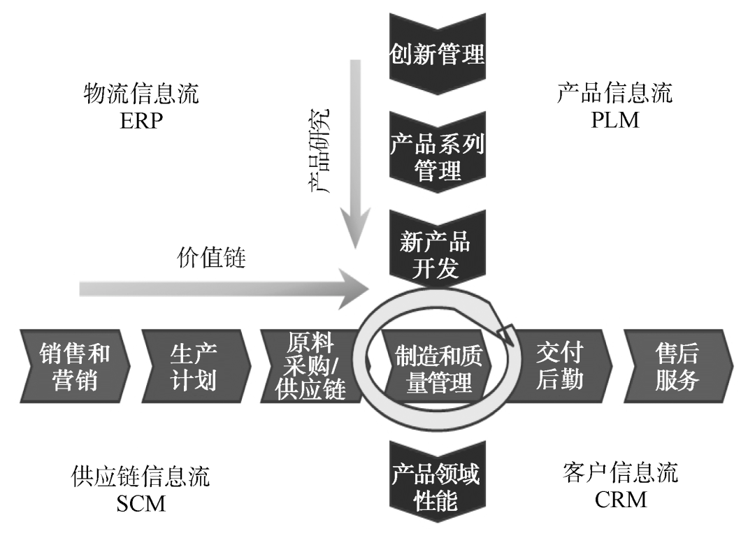 根据已有文献,常用的智能工厂建设的关键点如图1所示,其主要包括两方面内容:一方面,为产品研发线路,其从创新管理部门进行市场调研开始,到确定产品系列、产品结构及性能,再至产品制造、产品升级优化,最后确定产品的领域性能;另一方面,为产品价值链线路,包括接单、生产计划、原料的采购、产品制造和质量管理、交付使用及售后服务等。
