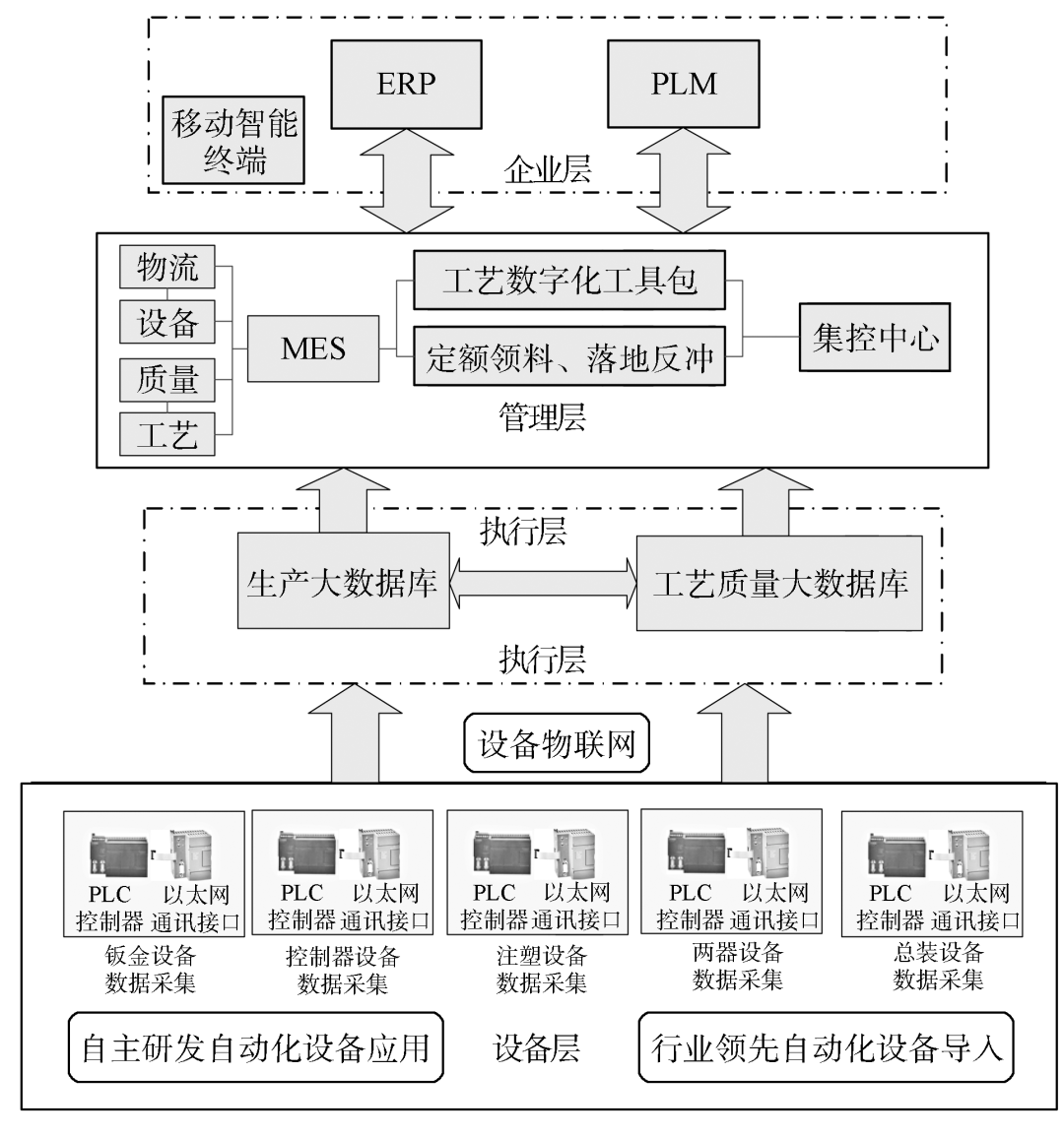 由图2可知,离散型智能工厂建设的主要内容包括设备层、执行层、管理层和企业层4个层次的建设。其中,设备层是基础,各类自动化设备要统一接口,自动化采集数据。执行层建立公司级的数据库,各类数据互联互通。管理层根据业务需求,构建各类管理模型,形成虚拟工厂,提升管理。企业层的集团化集中管理高度协同,地方企业和集团总部通过数据高度同步来实现智能化。